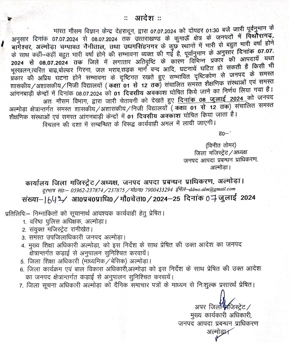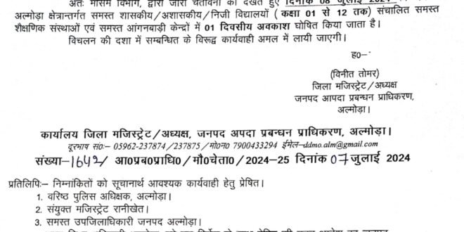 जिलाधिकारी द्वारा जारी आदेश में कहा गया है कि, “भारत मौसम विज्ञान केन्द्र देहरादून, द्वारा 07.07.2024 को दोपहर 01:30 बजे जारी पूर्वनुमान के अनुसार दिनांक 07.07.2024 से 08.07.2024 तक उत्तराखण्ड के कुमाऊँ क्षेत्र के जनपदों में पिथौरागढ़, • बागेश्वर, अल्मोड़ा चम्पावत नैनीताल, तथा उधमसिंहनगर के कुछ स्थानों में भारी से बहुत भारी वर्षा होने के साथ कहीं-कहीं बहुत भारी वर्षा होने की सम्भावना व्यक्त की गई है, पूर्वानुमान के अनुसार दिनांक 07.07. 2024 से 08.07.2024 तक जिले में लगातार अतिवृष्टि के कारण विभिन्न प्रकार की आपदायें यथा भूस्खलन, त्वरित बाढ़, बोल्डर गिरना, जल भराव, सड़क मार्ग बन्द आदि, घटनायें घटित हो सकती है किसी भी प्रकार की अप्रिय घटना होने सम्भावना के दृष्टिगत रखते हुए सम्भावित दृष्टिकोण से जनपद के समस्त शासकीय/अशासकीय / निजी विद्यालयों (कक्षा 01 से 12 तक) संचालित समस्त शैक्षणिक संस्थाओं एवं समस्त आंगनबाड़ी केन्द्रों में दिनांक 08.07.2024 को 01 दिवसीय अवकाश घोषित किये जाने का निर्णय लिया गया है। अतः मौसम विभाग, द्वारा जारी चेतावनी को देखते हुए दिनांक 08 जुलाई 2024 को जनपद अल्मोड़ा क्षेत्रान्तर्गत समस्त शासकीय/अशासकीय / निजी विद्यालयों (कक्षा 01 से 12 तक) संचालित समस्त शैक्षणिक संस्थाओं एवं समस्त आंगनबाड़ी केन्द्रों में 01 दिवसीय अवकाश घोषित किया जाता है। विचलन की दशा में सम्बन्धित के विरूद्ध कार्यवाही अमल में लायी जाएगी।”