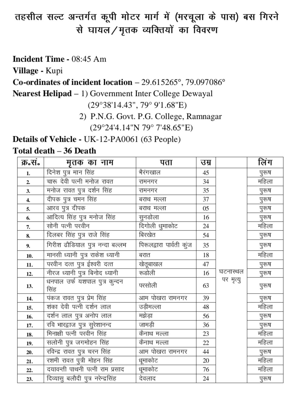 अल्मोड़ा जिला प्रबंधन अधिकारी की ओर से जारी की गई सूची के मुताबिक सल्ट तहसील के कूपी मोटर मार्ग में मरचूला के पास गढ़वाल मोटर ओनर्स यूनियन लिमिटेड की बस नंबर UK12 PA 0061 हादसे का शिकार हुई। हादसे में 28 लोगों ने मौके पर दम तोड़ा जबकि 8 घायलों की उपचार के दौरान अस्पताल में मौत हुई। कुल मिलाकर अभी तक 36 लोगों की मौत हो चुकी है। जबकि 27 घायलों का अलग-अलग अस्पतालों में उपचार जारी है।