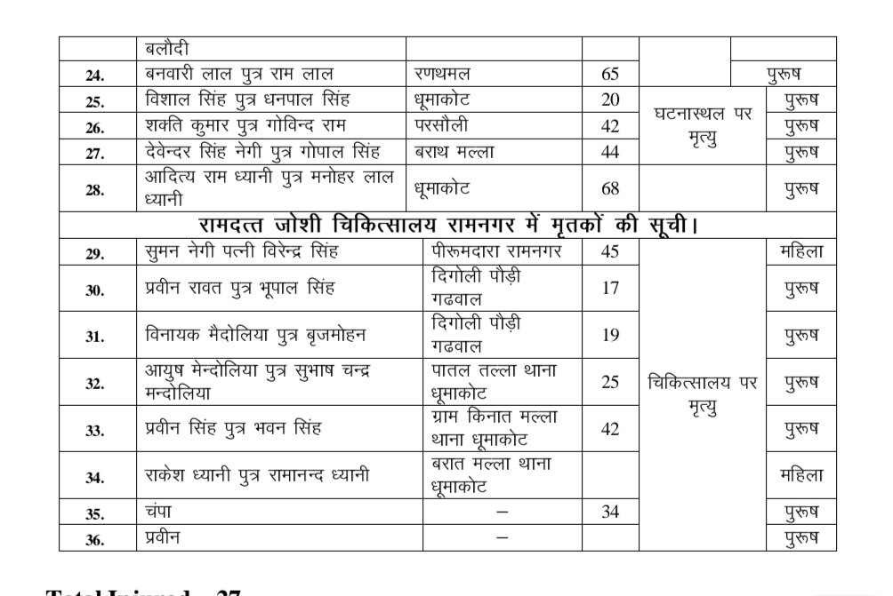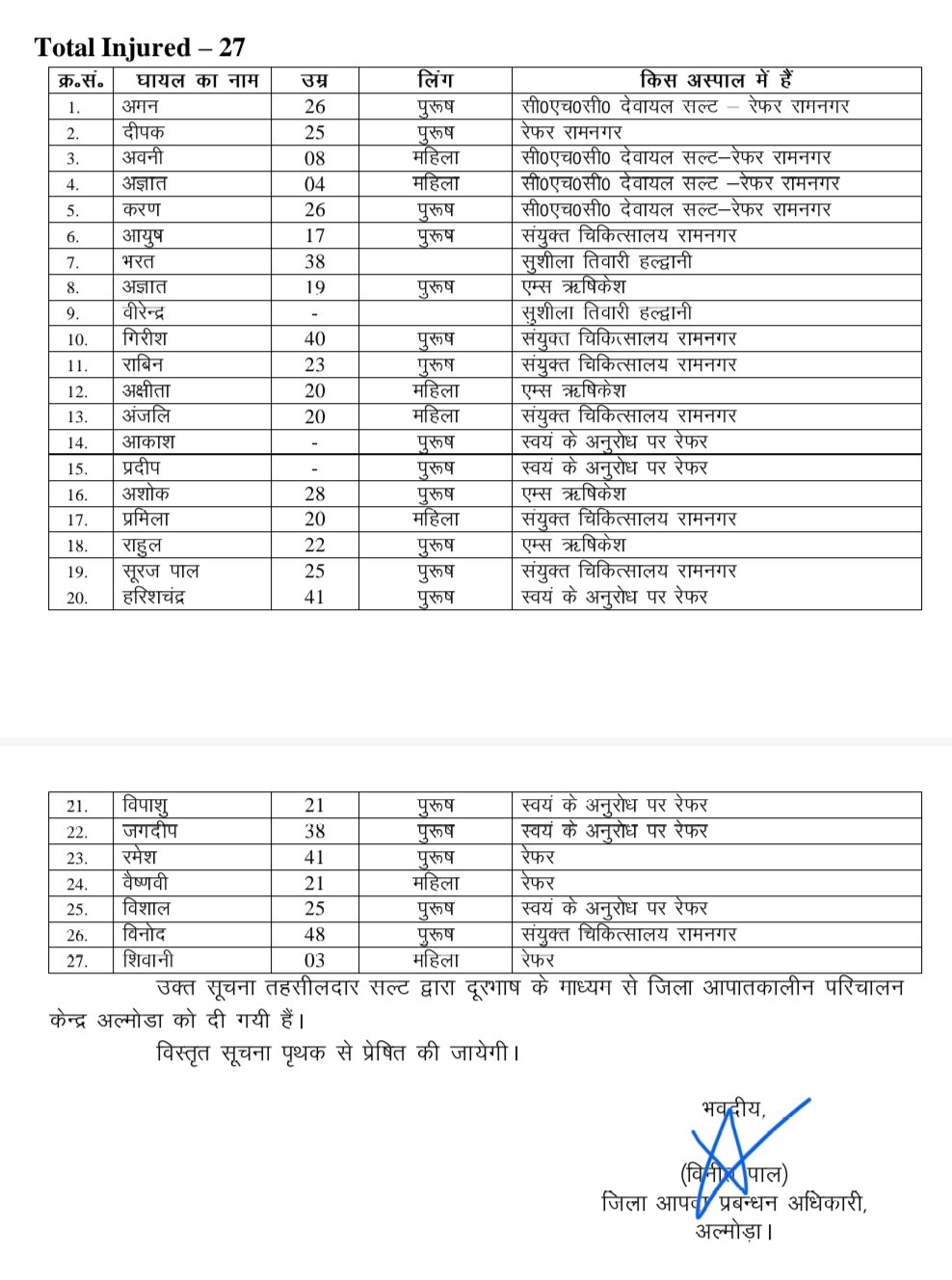अल्मोड़ा। सल्ट बस हादसे में कम से कम 36 लोगों की मौत हो चुकी है। इस हादसे में 27 लोग घायल हुए हैं। इन घायलों को उपचार रामनगर, सुशीला तिवारी अस्पताल और एम्स ऋषिकेश में चल रहा है। इसके अलावा कुछ घायलों का उनके अनुरोध पर निजी अस्पताल में भी उपचार चल रहा है।