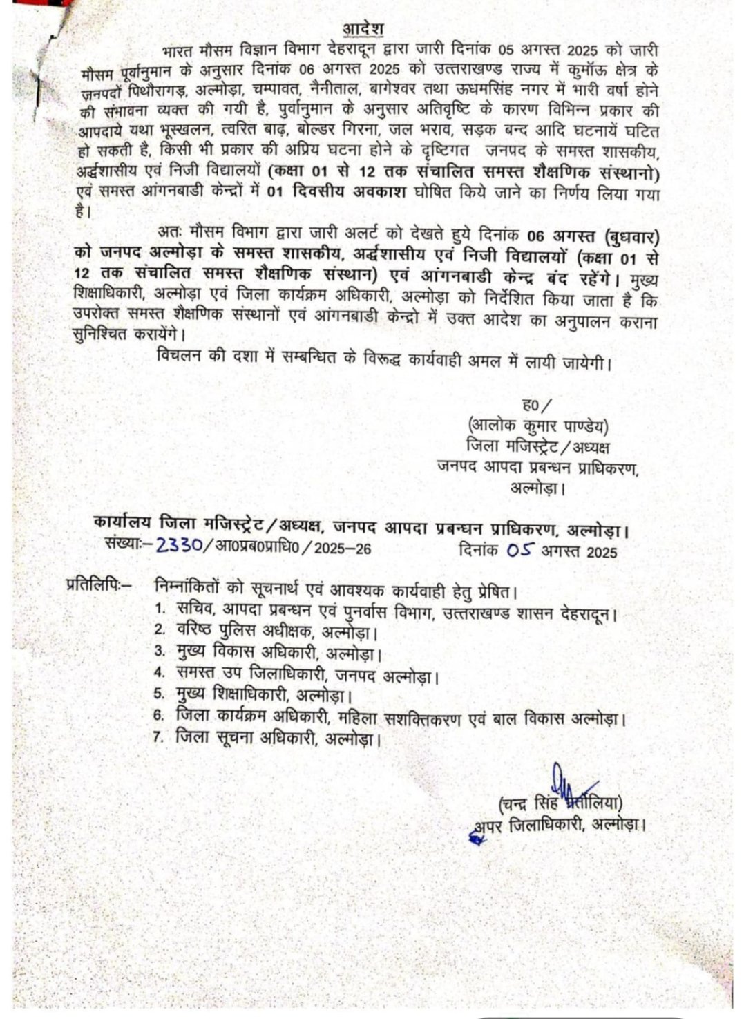 अल्मोड़ा। मौसम विज्ञान केंद्र देहरादून द्वारा जारी पूर्वानुमान के अनुसार छह अगस्त को अल्मोड़ा में भारी वर्षा की संभावना व्यक्त की गई है। जिसे देखते हुए जिला प्रशासन ने छात्र-छात्राओं की सुरक्षा के दृष्टिगत जनपद में संचालित समस्त शासकीय, गैर-शासकीय एवं निजी विद्यालयों एवं आंगनबाड़ी केंद्रों में छह अगस्त को अवकाश घोषित किया है।