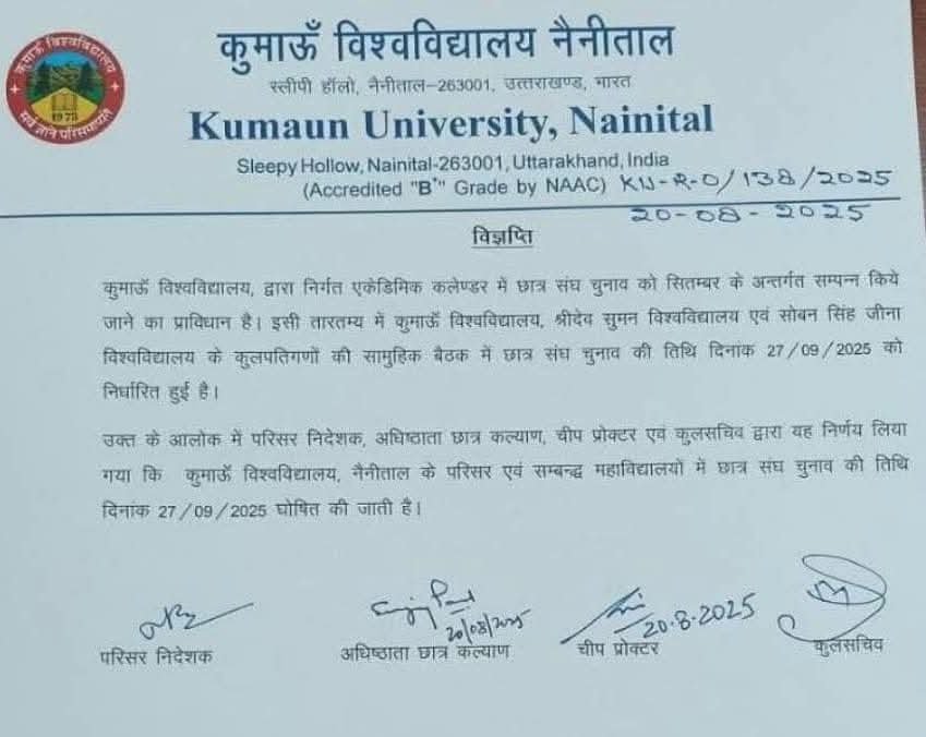 कुमाऊँ विश्वविद्यालय, नैनीताल के परिसर निदेशक, अधिष्ठाता छात्र कल्याण, चीफ प्रॉक्टर एवं कुलसचिव द्वारा यह औपचारिक घोषणा की गई कि विश्वविद्यालय के सभी परिसरों और सम्बद्ध महाविद्यालयों में 27 सितंबर 2025 को छात्र संघ चुनाव कराए जाएंगे।