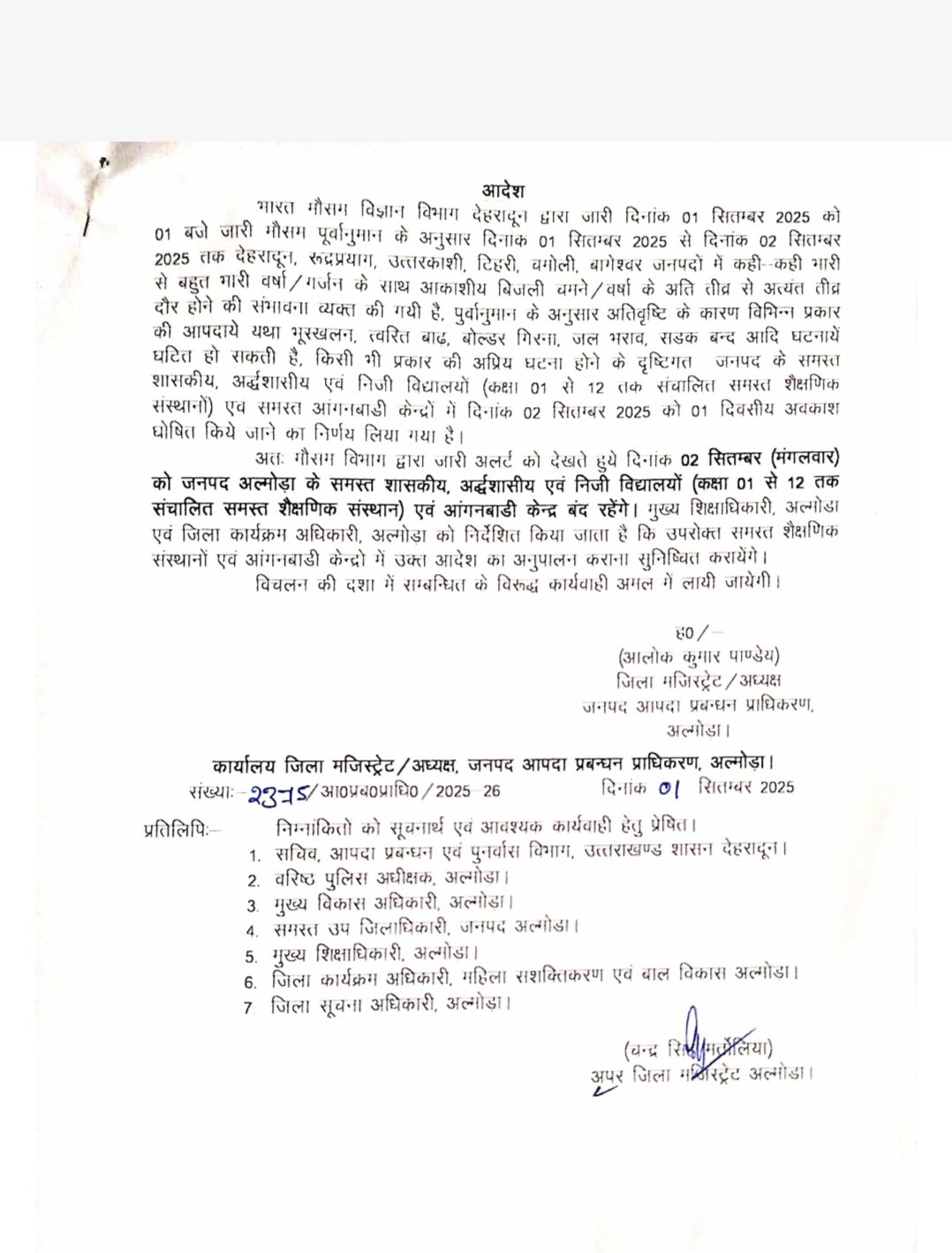 School closed:: बारिश का कहर, अल्मोड़ा में कल भी बंद रहेंगे स्कूल, देखे आदेश
