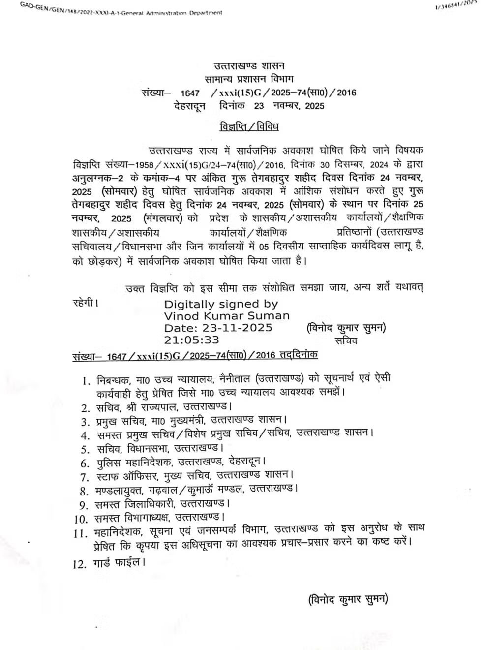 सचिव विनोद कुमार सुमन की ओर से रविवार देर रात इसके आदेश जारी किए गए है। आदेश में कहा कि, उत्तराखण्ड राज्य में सार्वजनिक अवकाश घोषित किये जाने विषयक विज्ञप्ति संख्या-1958/xxxi (15) G/24-74 (सा0)/2016, दिनांक 30 दिसम्बर, 2024 के द्वारा अनुलग्नक-2 के कमांक 4 पर अंकित गुरू तेगबहादुर शहीद दिवस दिनांक 24 नवम्बर, 2025 (सोमवार) हेतु घोषित सार्वजनिक अवकाश में आंशिक संशोधन करते हुए गुरू तेगबहादुर शहीद दिवस हेतु दिनांक 24 नवम्बर, 2025 (सोमवार) के स्थान पर दिनांक 25 नवम्बर, 2025 (मंगलवार) को प्रदेश के शासकीय/अशासकीय कार्यालयों/शैक्षणिक शासकीय/अशासकीय कार्यालयों / शैक्षणिक प्रतिष्ठानों (उत्तराखण्ड सचिवालय / विधानसभा और जिन कार्यालयों में 05 दिवसीय साप्ताहिक कार्यदिवस लागू है. को छोड़कर) में सार्वजनिक अवकाश घोषित किया जाता है।