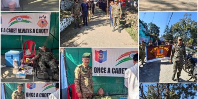 अल्मोड़ा। राष्ट्रीय कैडेट कोर दिवस (NCC DAY) पर के मौके पर 77 यूके बटालियन अल्मोड़ा द्वारा रक्तदान शिविर का आयोजन किया गया। शिविर में बटालियन के 42 कैडेट्स ने रक्तदान किया। जबकि द्वाराहाट के पचास कैडेट्स ने स्वेच्छा से रक्तदान कर मानव सेवा की मिशाल कायम की।