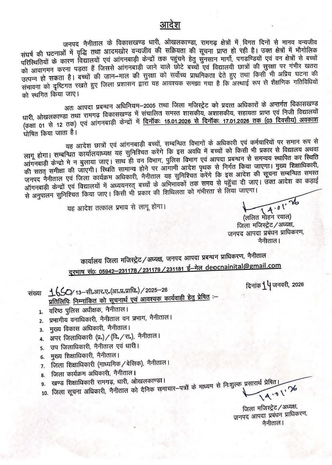 आदेश के तहत आंगनबाड़ी केंद्रों सहित कक्षा 1 से 12 तक के सभी सरकारी, अशासकीय और निजी विद्यालयों में तीन दिवसीय अवकाश घोषित किया गया है। यह आदेश तीन विकासखण्डों धारी, ओखलकांडा और रामगढ़ में ही लागू होगा। इन क्षेत्रों के स्कूल व आंगनबाड़ी केंद्र 15 से 17 जनवरी तक पूर्ण रूप से बंद रहेंगे।