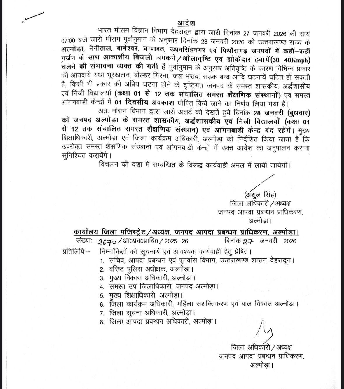मौसम विभाग द्वारा अल्मोड़ा, नैनीताल, बागेश्वर, चम्पावत, उधमसिंहनगर एवं पिथौरागढ़ जनपदों में कहीं-कहीं गर्जन के साथ आकाशीय बिजली चमकने, ओलावृष्टि एवं झोकेंदार हवायें (30-40Kmph) चलने की संभावना व्यक्त की गयी है। जिसे देखते हुए जिला प्रशासन ने सभी सरकारी व निजी विद्यालयों व आंगनबाड़ी केंद्रों में 28 जनवरी को अवकाश घोषित किया है।