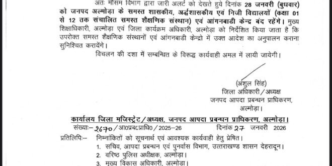 अल्मोड़ा: उत्तराखंड में मौसम ने एक बार फिर करवट ली है। मौसम विभाग की चेतावनी को देखते हुए अल्मोड़ा में 28 जनवरी यानी बुधवार को भी कक्षा एक से 12 तक के सभी स्कूलों व आंगनबाड़ी केंद्रों में अवकाश घोषित किया गया है।