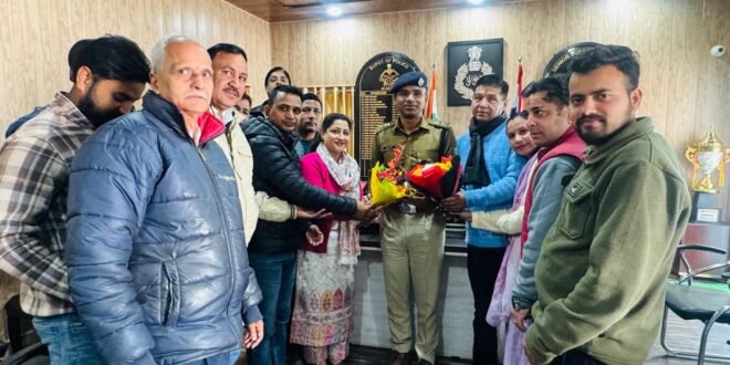 अल्मोड़ा: देवभूमि उद्योग व्यापार मण्डल के पदाधिकारियों ने नवनियुक्त एसएसपी चंद्रशेखर घोडके से मुलाकात कर उनका स्वागत किया। इस दौरान पदाधिकारियों ने एसएसपी को एक ज्ञापन भी सौंपा।